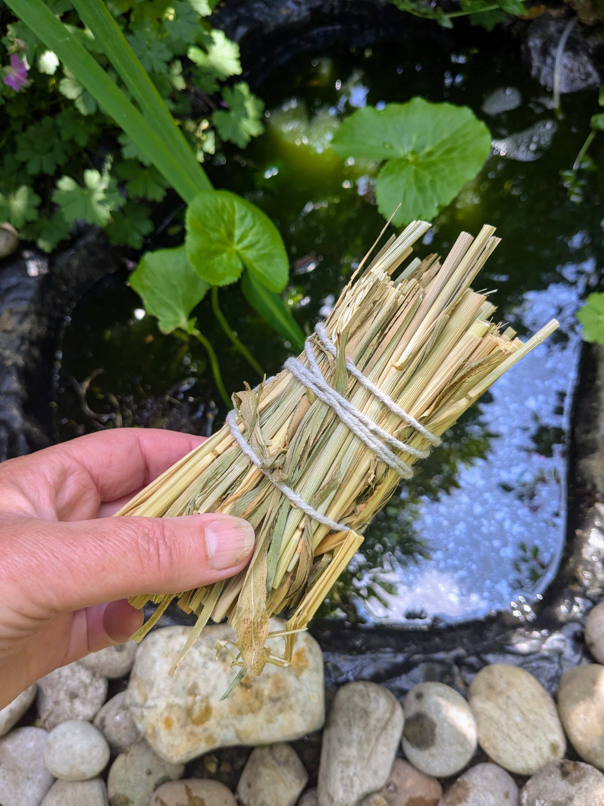 To try and combat the green water I brought home some barley straw from work (we don’t actually sell the straw but sometimes we have offcuts from dried flower projects). Barley is said to discourage the growth of algae by releasing retardant chemicals into the pond as it decomposes. It didn’t have a noticeable effect, possibly because it works best as a deterrent and doesn’t cure existing blooms.